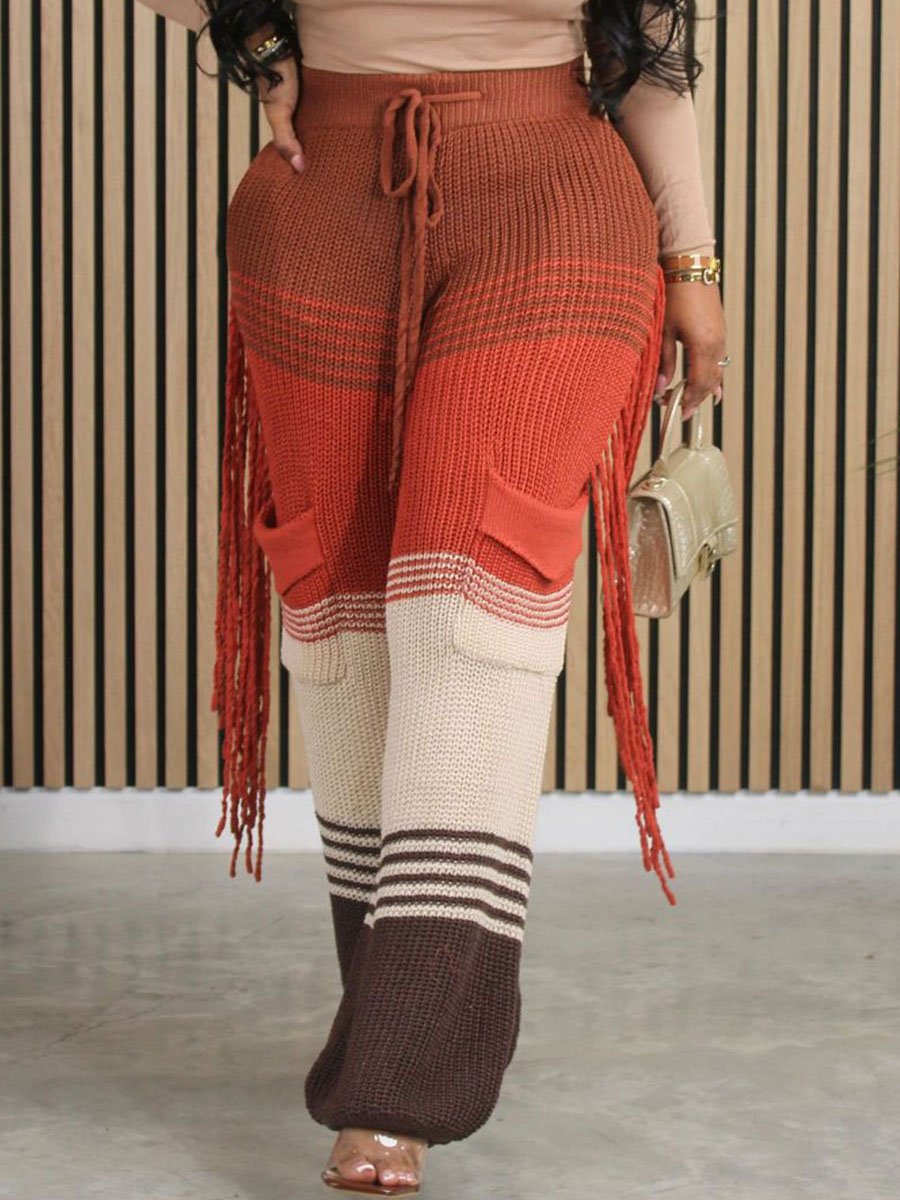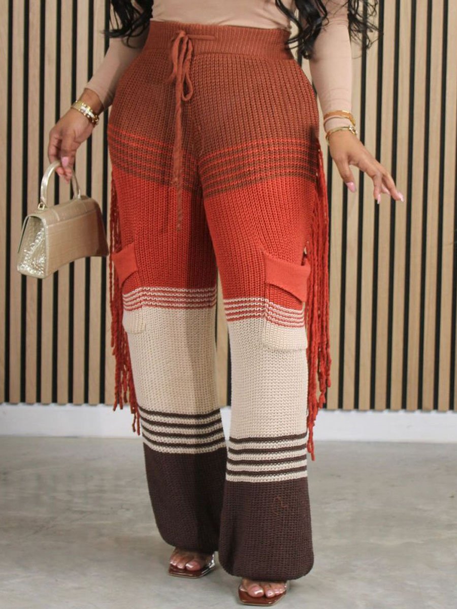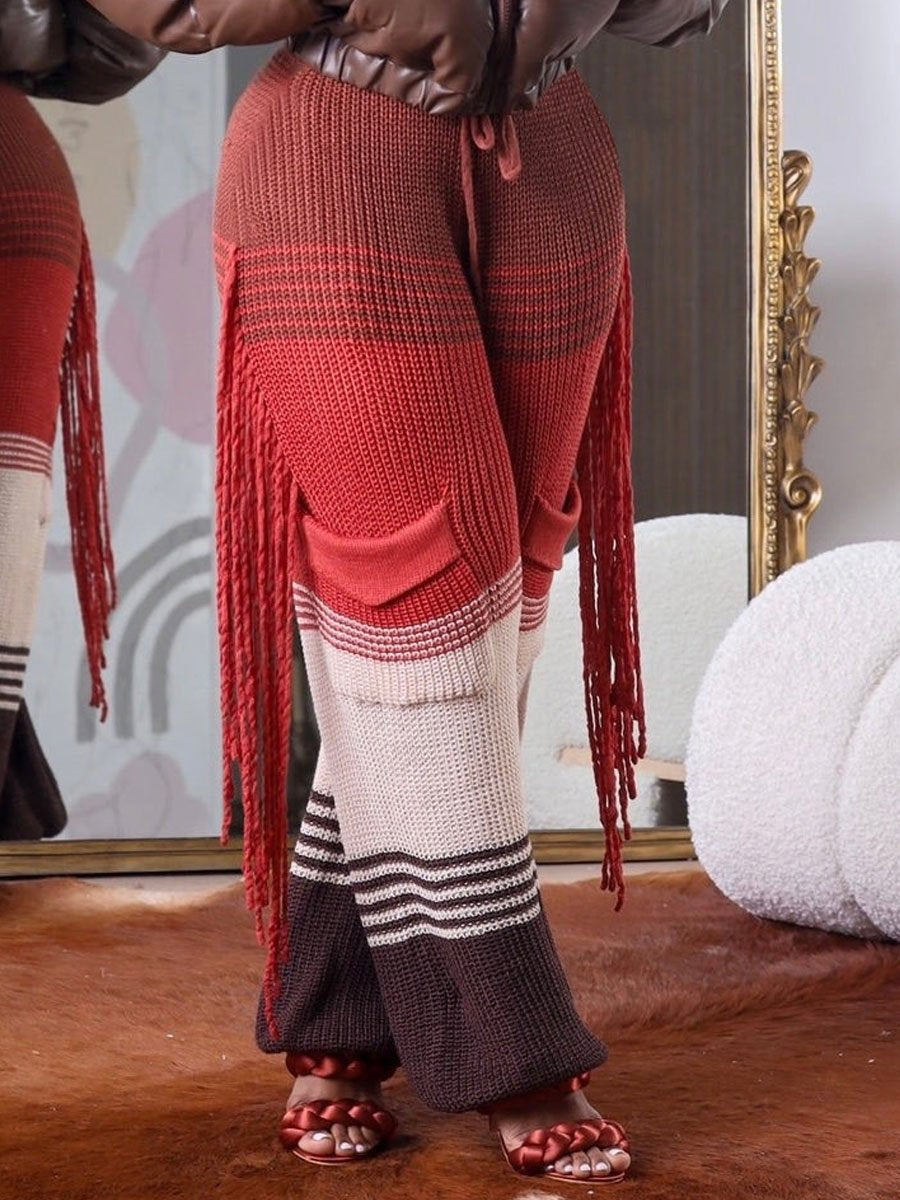 Casual Knitted Colorblock Tassel Loose Pants