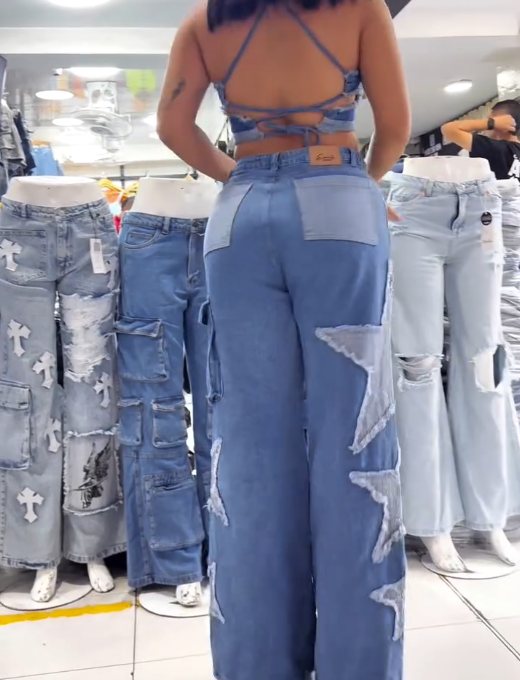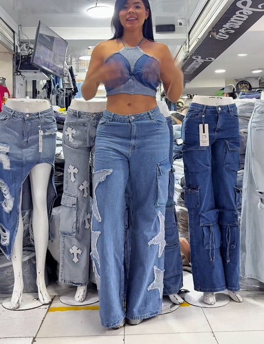 Matching high waist jeans featuring side cut outs and zipper detail on both sides