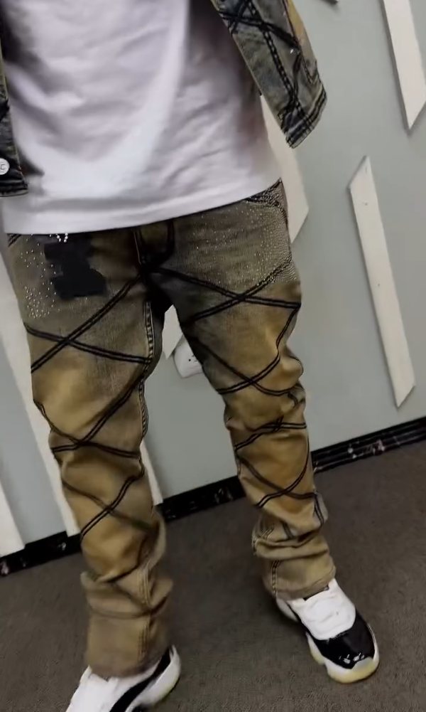 Men's Distressed Denim Rhinestone Jacket & Trousers Set