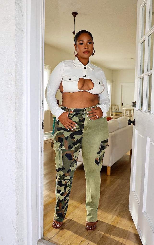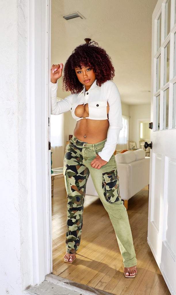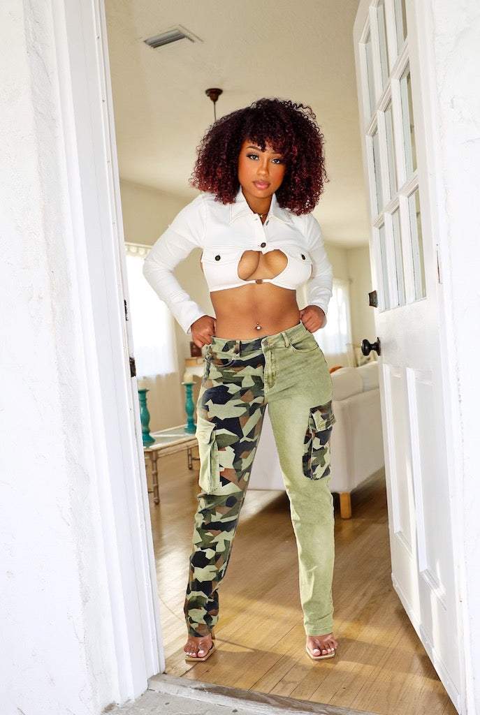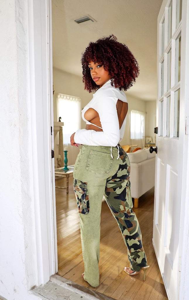 These camo print cargo jeans are a must-have. Features a soft stretchy denim fabric, front button and zipper closure, has pockets, side cargo pockets, boot cut.